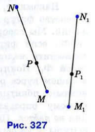 Пусть при заданном движении плоскости концы М и N отрезка MN отображаются в точки М1 и N1 (рис. 327). Докажем, что весь отрезок MN отображается на отрезок M1N1. Пусть Р — произвольная точка отрезка MN, Р1 — точка, в которую отображается точка Р. Тогда МР + PN = MN. Так как при движении расстояния сохраняются, то