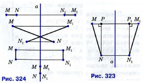 § 1. Понятие движения Понятие движенияОсевая симметрия обладает следующим важным свойством — это отображение плоскости на себя, которое сохраняет расстояния между точками. Поясним, что это значит. Пусть М и N — какие-либо точки, а М1 и N1 — симметричные им точки относительно прямой а (рис. 323). Из точек N и N1 проведём перпендикуляры NP и N1P1 к прямой ММ1. Прямоугольные треугольники MNP и M1N1P1 равны по двум катетам: МР = М1Р1 и NP = N1P1 (объясните, почему эти катеты равны). Поэтому гипотенузы MN и M1N1 также равны. Следовательно, расстояние между точками М и N равно расстоянию между симметричными им точками М1 и N1. Другие случаи расположения точек М, N и М1, N1 рассмотрите самостоятельно и убедитесь в том, что и в этих случаях MN = M1N1 (рис. 324). Таким образом, осевая симметрия является отображением, которое сохраняет расстояния между точками. Любое отображение, обладающее этим свойством, называется движением (или перемещением).