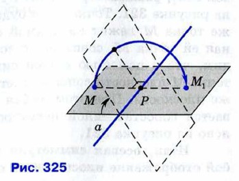 Итак, движение плоскости — это отображение плоскости на себя, сохраняющее расстояния. Почему отображение, сохраняющее расстояния, называют движением (или перемещением), можно пояснить на примере осевой симметрии. Её можно представить как поворот плоскости в пространстве на 180° вокруг оси а. На рисунке 325 показано, каким образом происходит такой поворот.