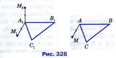 Доказательство Рассмотрим произвольное движение (обозначим его буквой g) и докажем, что оно является наложением. Возьмём какой-нибудь треугольник АВС. При движении g он отображается на равный ему треугольник А1В1С1. По определению равных треугольников существует наложение ƒ, при котором точки А, В и С отображаются соответственно в точки А1, В1 и С1. Докажем, что движение g совпадает с наложением ƒ. Предположим, что это не так. Тогда на плоскости найдётся хотя бы одна такая точка М, которая при движении g отображается в точку М„ а при наложении ƒ — в другую точку М2. Так как при отображениях ƒ u g сохраняются расстояния, то AM = А1М1, AM = А1М2, поэтому A1M1 = А1М2, т. е. точка А1 равноудалена от точек М1 и М2 (рис. 328). Аналогично доказывается, что точки В1 и С1 равноудалены от точек М1 и М2. Отсюда следует, что точки А1, В1 и С1 лежат на серединном перпендикуляре к отрезку М1М2. Но это невозможно, так как вершины треугольника А1В1С1 не лежат на одной прямой. Таким образом, отображения ƒ u g совпадают, т. е. движение g является наложением. Теорема доказана.