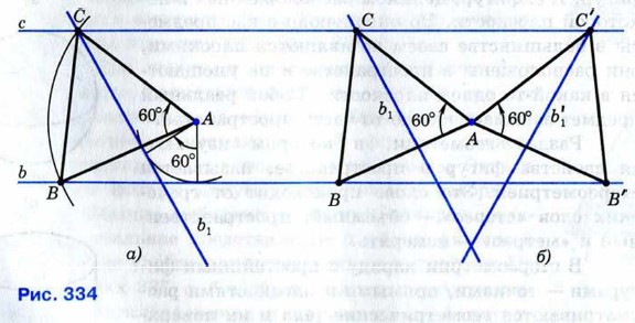 Глава XIII. Движения Дополнительные задачи к главе XIII. Движения(окончание)1181. 1182. Используя параллельный перенос, постройте трапецию по её основаниям и диагоналям. 1183. Решение Допустим, что задача решена и искомый треугольник АВС построен (рис. 334, а). При повороте плоскости вокруг точки А на 60° по часовой стрелке вершина В отображается в вершину С, поэтому прямая b отображается на прямую b1, проходящую через точку С. Прямую бх легко построить, не пользуясь точками В и С (см. задачу 1171). Построив прямую b1, находим точку С, в которой прямая b1 пересекается с прямой с. Затем, построив окружность с центром А радиуса АС, находим точку В. На рисунке 334, а выполнено построение. Задача имеет два решения, одно из которых получается при повороте плоскости вокруг точки А на 60° по часовой стрелке (