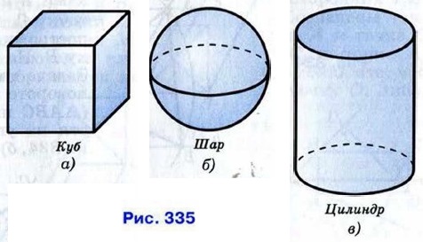 § 1. Многогранники Предмет стереометрииПоследняя глава является введением в стереометрию — это тот раздел геометрии, в котором изучаются свойства фигур в пространстве. Более основательно вы будете заниматься стереометрией в старших классах, а здесь мы познакомим вас с некоторыми пространственными фигурами и формулами для вычисления их объёмов и площадей поверхностей. До сих пор мы занимались планиметрией — изучали свойства плоских геометрических фигур, т. е. фигур, целиком расположенных в некоторой плоскости. Но окружающие нас предметы в большинстве своём не являются плоскими, они расположены в пространстве и не умещаются в какой-то одной плоскости. Любой реальный предмет занимает какую-то часть пространства. Раздел геометрии, в котором изучаются свойства фигур в пространстве, называется стереометрией. Это слово происходит от греческих слов «стерео» — объёмный, пространственный и «метрео» — измерять. В стереометрии наряду с простейшими фигурами — точками, прямыми и плоскостями рассматриваются геометрические тела и их поверхности. Представление о геометрических телах дают окружающие нас предметы. Так, например, кристаллы имеют форму геометрических тел, поверхности которых составлены из многоугольников. Такие поверхности называются многогранниками. Одним из простейших многогранников является куб (рис. 335, а). Он составлен из шести равных квадратов. Капли жидкости в невесомости принимают форму геометрического тела, называемого шаром (рис. 335, б). Такую же форму имеет футбольный мяч. Консервная банка имеет форму геометрического тела, называемого цилиндром (рис. 335, в).