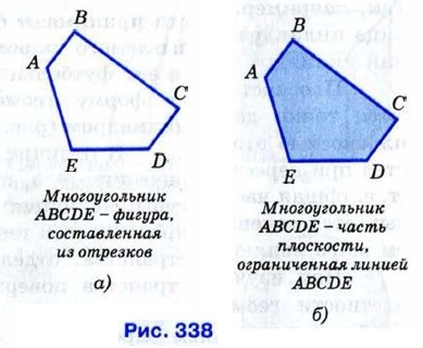 Напомним, что в планиметрии при изучении многоугольников мы рассматривали многоугольник либо как замкнутую линию, составленную из отрезков и не имеющую самопересечений (рис. 338, а), либо как часть плоскости, ограниченную этой линией, включая её саму (рис. 338, б). При изучении многогранников мы будем пользоваться вторым толкованием многоугольника.