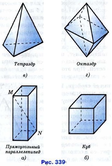 С одним из самых простых многогранников — прямоугольным параллелепипедом — вы знакомы давно. Этот многогранник составлен из шести прямоугольников (рис. 339, а). Форму прямоугольного параллелепипеда имеют коробки, комнаты и многие другие предметы. На рисунках 339, б, в, г изображены другие многогранники: куб (это прямоугольный параллелепипед, составленный из шести равных квадратов), тетраэдр, октаэдр.