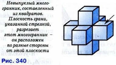 Многогранники бывают выпуклыми и невыпуклыми. Выпуклый многогранник характеризуется тем, что он расположен по одну сторону от плоскости каждой своей грани. На рисунке 339 изображены выпуклые многогранники, а на рисунке 340 — невыпуклый многогранник.