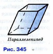 Четырёхугольная призма, основаниями которой являются параллелограммы, называется параллелепипедом (рис. 345). Все шесть граней параллелепипеда — параллелограммы.