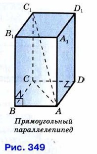 У прямоугольника два измерения — длина и ширина. При этом, как мы знаем, квадрат диагонали прямоугольника равен сумме квадратов двух его измерений. Оказывается, что аналогичным свойством обладает и прямоугольный параллелепипед: квадрат диагонали прямоугольного параллелепипеда равен сумме квадратов трёх его измерений. В самом деле, обратимся к рисунку 349, на котором изображён прямоугольный параллелепипед ABCDA1B1C1D1, и докажем, что