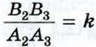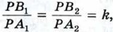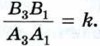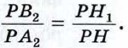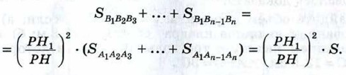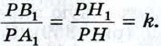 Докажем, что объём призмы равен Sh. Любая секущая плоскость, параллельная плоскости оснований, даёт в качестве сечения призмы равный её основанию многоугольник площади S, а в качестве сечения прямоугольного параллелепипеда — прямоугольник площади S. Следовательно, объём призмы равен объёму параллелепипеда. Но объём прямоугольного параллелепипеда равен произведению площади основания на высоту, т. е. равен Sh. Поэтому и объём призмы равен Sh. 1199. Найдите объём прямой призмы АВСА1В1С1, если ∠BAC= 120°, АВ = 5 см, АС = 3 см, а наибольшая из площадей боковых граней равна 35 см2. 1200. Найдите объём правильной «-угольной призмы, все рёбра ко торой равны а, если: а) n = 3; б) n = 4; в) n = 6; г) n = 8. 1201. Существует ли тетраэдр, у которого пять углов граней — прямые? 1202. Изобразите тетраэдр DABC и на рёбрах DB, DC и ВС отметьте соответственно точки М, N и К. Постройте точку пересечения: а) прямой MN и плоскости АВС; б) прямой KN и плоскости ABD. 1203. Изобразите тетраэдр KLMN и постройте сечение этого тетраэдра плоскостью, проходящей через ребро KL и середину А ребра MN. 1204. Изобразите тетраэдр DABC, отметьте точки М и N на рёбрах BD и CD и внутреннюю точку К грани АВС. Постройте сечение тетраэдра плоскостью MNK. 1205. Докажите, что все апофемы правильной пирамиды равны друг другу. 1206. Докажите, что площадь боковой поверхности правильной пирамиды (т. е. сумма площадей её боковых граней) равна половине произведения периметра основания на апофему. 1207. Основанием пирамиды является ромб, сторона которого равна 5 см, а одна из диагоналей равна 8 см. Найдите боковые рёбра пирамиды, если её высота проходит через точку пересечения диагоналей основания и равна 7 см. 1208. Найдите площадь боковой поверхности правильной шестиугольной пирамиды, если сторона её основания равна а, а площадь боковой грани равна площади сечения, проведённого через вершину пирамиды и большую диагональ основания. 1209.* Через точку Н1 высоты PH пирамиды РА1А2...Аn проведена секущая плоскость β, параллельная плоскости α её основания. Докажите, что площадь полученного сечения равна Решение Докажем это утверждение сначала для треугольной пирамиды, а затем — для произвольной пирамиды. Рассмотрим треугольную пирамиду РА1А2А3 и докажем, что рассматриваемое сечение представляет собой треугольник В1В2В3, подобный треугольнику А1А2А3 с коэффициентом подобия
