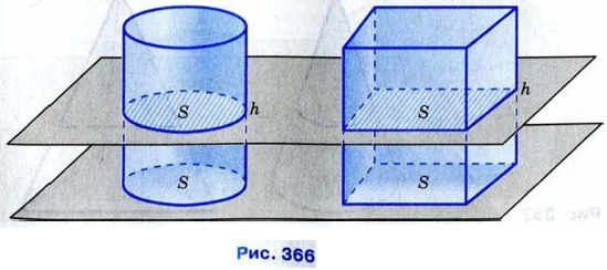 § 2. Тела и поверхности вращения Задачи к § 2. Тела и поверхности вращения1213. Докажите, что объём цилиндра равен произведению площади основания на высоту. Решение Воспользуемся принципом Кавальери. Рассмотрим цилиндр и призму с площадями оснований, равными S, и высотами, равными h, «стоящие» на одной плоскости (рис. 366). Любая секущая плоскость, параллельная этой плоскости, даёт в качестве сечения цилиндра круг площади S, а в качестве сечения призмы — многоугольник площади S. Значит, объём цилиндра равен объёму призмы. Но объём призмы равен Sh. Поэтому и объём цилиндра равен Sh.
