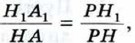 Проведём секущую плоскость β, параллельную плоскости а и пересекающую высоты PH и QO в точках Н1 и O1 соответственно. В сечении конуса плоскостью β получится круг радиуса Н1А1. Треугольники РН1А11и PHА подобны по двум углам (∠P — общий, ∠PH1А1 = ∠PHA = 90°, так как в противном случае прямые НА и Н1А1, а значит, и плоскости α и β пересекались бы, что противоречит условию). Поэтому