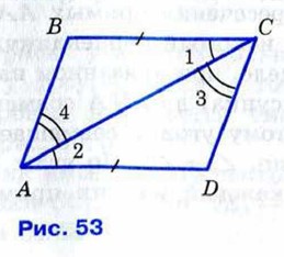 95. На рисунке 53 BC = AD, ∠1 = ∠2. а) Докажите, что треугольники АВС и CDA равны; б) найдите АВ и ВС, если AD = 17 см, DC = 14 см.