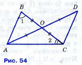 96. На рисунке 54 ОА = OD, ОВ = ОС, ∠1 = 74°, ∠2 = 36°. а) Докажите, что треугольники АОВ и DOC равны; б) найдите ∠ACD.
