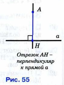 § 2. Медианы, биссектрисы и высоты треугольника Перпендикуляр к прямойРассмотрим прямую а и точку А, не лежащую на этой прямой (рис. 55). Соединим точку А отрезком с точкой Н прямой а. Отрезок АН называется перпендикуляром, проведённым из точки А к прямой а, если прямые АН и а перпендикулярны. Точка Н называется основанием перпендикуляра.