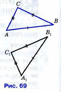 Доказательство Рассмотрим треугольники АВС и A1B1C1, у которых АВ = А1В1, ВС = В1С1, СА = С1А1 (рис. 69). Докажем, что