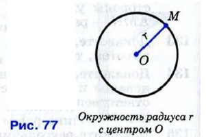 Данная точка называется центром окружности, а отрезок, соединяющий центр с какой-либо точкой окружности, — радиусом окружности (рис. 77). Из определения окружности следует, что все радиусы имеют одну и ту же длину.