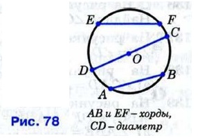Отрезок, соединяющий две точки окружности, называется её хордой. Хорда, проходящая через центр окружности, называется её диаметром. На рисунке 78 отрезки АВ и EF — хорды окружности, отрезок CD — диаметр окружности. Очевидно, диаметр окружности в два раза больше её радиуса. Центр окружности является серединой любого диаметра.