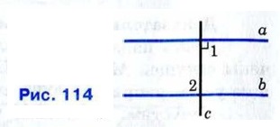 Действительно, пусть а || b, с ⊥ a, т. е. ∠1 = 90° (рис. 114). Прямая с пересекает прямую а, поэтому она пересекает также прямую b. При пересечении параллельных прямых а и Ь секущей с образуются равные накрест лежащие углы: ∠1=∠2. Так как ∠1 = 90°, то и ∠2 = 90°, т. е. с ⊥ b, что и требовалось доказать.