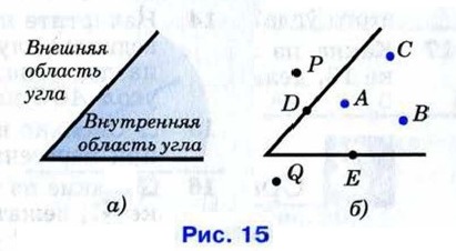 Любой угол разделяет плоскость на две части. Если угол неразвёрнутый, то одна из частей называется внутренней, а другая — внешней областью этого угла (рис. 15, а). На рисунке 15,6 изображён неразвёрнутый угол. Точки А, В, С лежат внутри этого угла (т. е. во внутренней области угла), точки D и Е — на сторонах угла, а точки Р и Q — вне угла (т. е. во внешней области угла).