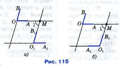Доказательство Пусть ∠AOB и ∠A1O1B1 — данные углы и ОА || О1А1, ОВ || О1В1. Если угол АОВ развёрнутый, то и угол А1О1В1 — развёрнутый (объясните почему), поэтому эти углы равны. Пусть ∠AOB — неразвёрнутый угол. Возможные случаи расположения углов АОВ и А1О1В1 изображены на рисунке 115, а и б. Прямая О1В1 пересекает прямую О1А1 и, следовательно, пересекает параллельную ей прямую ОА в некоторой точке М. Параллельные прямые ОВ и О1В1 пересечены секущей ОМ, поэтому один из углов, образованных при пересечении прямых О1В1 и ОА (угол 1 на рисунке 115), равен углу АОВ (как накрест лежащие углы). Параллельные прямые ОА и О1А1 пересечены секущей О1М, поэтому либо ∠1 = ∠A1O1B1 (рис. 115, а), либо ∠1 + ∠A1O1B1 = 180° (рис. 115, б). Из равенства ∠1 = ∠AOB и последних двух равенств следует, что либо ∠AOB = ∠A1O1B1 (см. рис. 115, а), либо ∠AOB + ∠A1O1B1 = 180° (см. рис. 115, б). Теорема доказана.