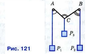 210. Два тела Р1 и Р2 подвешены на концах нити, перекинутой через блоки А и В (рис. 121). Третье тело Р3 подвешено к той же нити в точке С и уравновешивает тела Р1 и Р2. (При этом АР1 || ВР2 || СР3.) Докажите, что ∠ACB = ∠CAP1 + ∠CBP2.