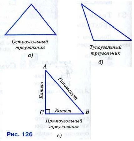 § 1. Сумма углов треугольника Остроугольный, прямоугольный и тупоугольный треугольникиИз теоремы о сумме углов треугольника следует, что если в треугольнике один из углов прямой или тупой, то сумма двух других углов не превосходит 90°, и поэтому каждый из них острый. Таким образом, в любом треугольнике либо все углы острые, либо два угла острые, а третий тупой или прямой. Если все три угла треугольника острые, то треугольник называется остроугольным (рис. 126, а). Если один из углов треугольника тупой, то треугольник называется тупоугольным (рис. 126, б). Если один из углов треугольника прямой, то треугольник называется прямоугольным. Сторона прямоугольного треугольника, лежащая против прямого угла, называется гипотенузой, а две другие стороны — катетами. На рисунке 126, в изображён прямоугольный треугольник АВС с прямым углом С.