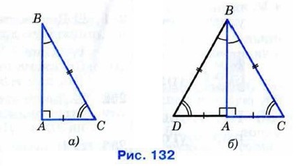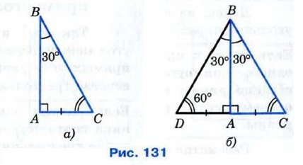 Рассмотрим прямоугольный треугольник АВС, в котором угол А — прямой, ∠B = 30° и, значит, ∠C = 60° (рис. 131, а). Докажем, что Приложим к треугольнику АВС равный ему треугольник ABD так, как показано на рисунке 131, б. Получим треугольник BCD, в котором ∠B = ∠D = 60°, поэтому DC = BC. Но