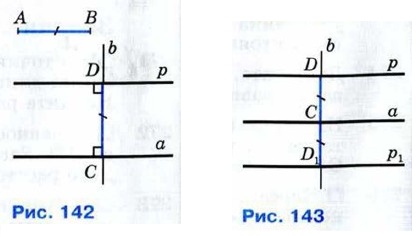 Как видно из построения, для любой данной прямой а и любого данного отрезка АВ искомую прямую можно построить, причём задача имеет два решения (прямые р и р, на рисунке 143).