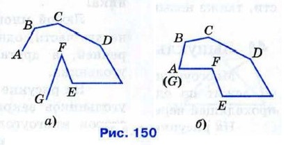 § 1. Многоугольники МногоугольникДо сих пор в центре нашего внимания был самый простой из многоугольников — треугольник. В этой главе будем изучать более сложные многоугольники, в основном различные виды четырёхугольников: параллелограмм, прямоугольник, ромб, квадрат. Кроме того, в этой главе речь пойдёт о симметрии геометрических фигур, в том числе указанных четырёхугольников. Симметрия играет важную роль не только в геометрии, но и искусстве, архитектуре, технике. В окружающей обстановке мы видим немало симметричных предметов — фасады зданий, узоры на коврах и тканях, листья деревьев. Рассмотрим фигуру, составленную из отрезков АВ, ВС, CD, ..., EF, FG так, что смежные отрезки (т. е. отрезки АВ и ВС, ВС и CD, ..., EF и FG) не лежат на одной прямой. Такая фигура называется ломаной ABCD...FG (рис. 150, а). Отрезки, из которых составлена ломаная, называются её звеньями, а концы этих отрезков — вершинами ломаной. Сумма длин всех звеньев называется длиной ломаной. Концы ломаной ABCD ... FG, т. е. точки А и G, могут быть различными, а могут совпадать (рис. 150, б). В последнем случае ломаная называется замкнутой, и её звенья FG и АВ также считаются смежными. Если несмежные звенья замкнутой ломаной не имеют общих точек, то эта ломаная называется многоугольником, её звенья называются сторонами многоугольника, а длина ломаной называется периметром многоугольника.