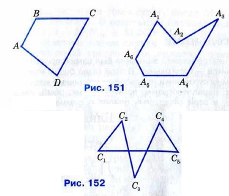 Многоугольник с n вершинами называется n-угольником; он имеет n сторон. Примером многоугольника является треугольник. На рисунке 151 изображены четырёхугольник ABCD и шестиугольник А1А2А3А4А5А6. Фигура, изображённая на рисунке 152, не является многоугольником, так как несмежные отрезки С1C5 и С2С3 (а также С3С4 и С1C5) имеют общую точку.