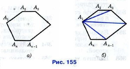 Рассмотрим выпуклый n-угольник, изображённый на рисунке 155,а. Углы АnА1А2, А1А2А3, ..., Аn-1АnА1 называются углами этого многоугольника. Найдём их сумму.