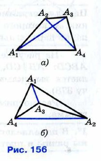 Каждая диагональ выпуклого четырёхугольника разделяет его на два треугольника. Одна из диагоналей невыпуклого четырёхугольника также разделяет его на два треугольника (см. рис. 156, б).