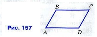 На рисунке 157 изображён параллелограмм ABCD: АВ || CD, AD || ВС. Параллелограмм является выпуклым четырёхугольником (см. задачу 378).