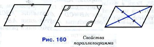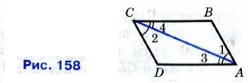 Рассмотрим параллелограмм ABCD (рис. 158). Диагональ АС разделяет его на два треугольника: АВС и ADC. Эти треугольники равны по стороне и двум прилежащим углам (АС — общая сторона, ∠1 = ∠2 и ∠3 = ∠4 как накрест лежащие углы при пересечении секущей АС параллельных прямых АВ и CD, AD и ВС соответственно). Поэтому