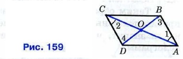 Пусть О — точка пересечения диагоналей АС и BD параллелограмма ABCD (рис. 159). Треугольники АОВ и COD равны по стороне и двум прилежащим углам (АВ = CD как противоположные стороны параллелограмма, ∠1 = ∠2 и ∠3 = ∠4 как накрест лежащие углы при пересечении параллельных прямых АВ и CD секущими АС и BD соответственно). Поэтому АО = ОС и OB = OD, что и требовалось доказать.