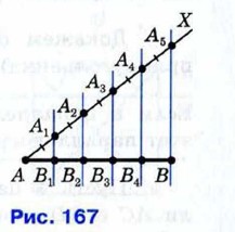 § 2. Параллелограмм и трапеция Ответы к задачам к § 2. Параллелограмм и трапеция394. Даны три точки А, B и С, не лежащие на одной прямой. Постройте параллелограмм так, чтобы три его вершины совпадали с данными точками. Сколько таких параллелограммов можно построить? 395. Даны острый угол hk и два отрезка P1Q1 и P2Q2. Постройте параллелограмм ABCD так, чтобы расстояние между параллельными прямыми АВ и DC равнялось P1Q1, AB = P2Q2 и ∠A = ∠ hk. 396. Разделите данный отрезок АВ на n равных частей. Решение Проведём луч АХ, не лежащий на прямой АВ, и на нём от точки А отложим последовательно n равных отрезков АА1, А1А2, ..., Аn-1Аn (рис. 167), т. е. столько равных отрезков, на сколько равных частей нужно разделить данный отрезок АВ (на рисунке 167 п = 5). Проведём прямую АnB (точка Аn — конец последнего отрезка) и построим прямые, проходящие через точки А1, А2, ..., Аn-1 и параллельные прямой АпВ. Эти прямые пересекают отрезок АВ в точках В1 В2, ..., Bn-1 которые по теореме Фалеса (задача 385) делят отрезок АВ на n равных частей.