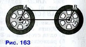 377. В параллелограмме MNPQ проведён перпендикуляр NH к прямой MQ, причём точка Н лежит на стороне MQ. Найдите стороны и углы параллелограмма, если известно, что МН = 3 см, HQ = 5 см, ∠MNH = 30°. 378. Докажите, что параллелограмм является выпуклым четырёхугольником. Решение Рассмотрим параллелограмм ABCD (см. рис. 157) и докажем, что он лежит по одну сторону от каждой прямой, проходящей через две его соседние вершины. Возьмём, например, прямую АВ. Отрезок CD не имеет общих точек с прямой АВ, так как АВ || CD. Значит, этот отрезок лежит по одну сторону от прямой АВ. Но тогда и отрезки ВС и AD лежат по ту же сторону от прямой АВ. Таким образом, параллелограмм ABCD лежит по одну сторону от прямой АВ. 379. 380. На сторонах АВ, ВС, CD и DA четырёхугольника ABCD отмечены соответственно точки М, N, Р и Q так, что АМ = СР, BN = DQ, BM = DP, NC = QA. Докажите, что ABCD и MNPQ — параллелограммы. 381. На рисунке 163 изображены два одинаковых колеса тепловоза. Радиусы О1А и О2В равны. Стержень АВ, длина которого равна расстоянию О1О2 между центрами колёс, передаёт движение от одного колеса к другому. Докажите, что отрезки АВ и О1О2 либо параллельны, либо лежат на одной прямой.