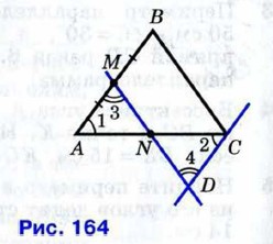382. Диагонали параллелограмма ABCD пересекаются в точке О. Докажите, что четырёхугольник A1B1C1D1, вершинами которого являются середины отрезков ОА, ОВ, ОС и OD, — параллелограмм. 383. На диагонали BD параллелограмма ABCD отмечены две точки Р и Q так, что РВ = QD. Докажите, что четырёхугольник APCQ — параллелограмм. 384. Через середину М стороны АВ треугольника АВС проведена прямая, параллельная стороне ВС. Эта прямая пересекает сторону АС в точке N. Докажите, что AN = NC. Решение Через точку С проведём прямую, параллельную прямой АВ, и обозначим буквой D точку пересечения этой прямой с прямой MN (рис. 164). Так как AM = МВ по условию, а МВ = CD как противоположные стороны параллелограмма BCDM, то AM = DC. Треугольники AMN и CDN равны по второму признаку равенства треугольников (AM = CD, ∠1=∠2 и ∠3 = ∠4 как накрест лежащие углы при пересечении параллельных прямых АВ и CD секущими АС и MD), поэтому AN = NC.