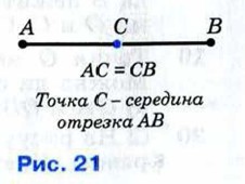 Точка отрезка, делящая его пополам, т. е. на два равных отрезка, называется серединой отрезка. На рисунке 21 точка С — середина отрезка АВ.