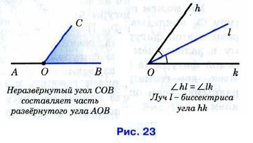 Если две другие стороны также совместятся, то углы полностью совместятся и, значит, они равны. Если же эти стороны не совместятся, то меньшим считается тот угол, который составляет часть другого. На рисунке 22, б угол 1 составляет часть угла 2, поэтому ∠1 < ∠2. Неразвёрнутый угол составляет часть развёрнутого угла (рис. 23), поэтому развёрнутый угол больше неразвёрнутого угла. Любые два развёрнутых угла, очевидно, равны.