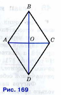 Рассмотрим ромб ABCD (рис. 169). Требуется доказать, что его диагонали АС и BD взаимно перпендикулярны и каждая диагональ делит соответствующие углы ромба пополам. Докажем, например, что ∠ВАС = ∠DAC.