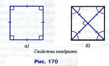 По определению ромба все его стороны равны, в частности АВ = AD, поэтому треугольник BAD равнобедренный. Так как ромб является параллелограммом, то его диагонали точкой О пересечения делятся пополам. Следовательно, отрезок АО — медиана равнобедренного треугольника BAD, проведённая к основанию, а значит, высота и биссектриса этого треугольника. Поэтому AC ⊥ BD и ∠BAC = ∠DAC, что и требовалось доказать. Квадратом называется прямоугольник, у которого все стороны равны. Прямоугольник является параллелограммом, поэтому и квадрат является параллелограммом, у которого все стороны равны, т. е. ромбом. Отсюда следует, что квадрат обладает всеми свойствами прямоугольника и ромба. Сформулируем основные свойства квадрата.