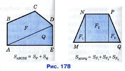Далее, пусть многоугольник составлен из нескольких многоугольников так, что внутренние области любых двух из этих многоугольников не имеют общих точек, как показано на рисунке 178. Очевидно, величина части плоскости, занимаемой всем многоугольником, является суммой величин тех частей плоскости, которые занимают составляющие его многоугольники. Итак:
