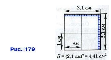 Краткую формулировку этого свойства следует понимать так: если сторона квадрата при выбранной единице измерения отрезков выражается числом а, то площадь этого квадрата выражается числом а2. На рисунке 179 изображён квадрат, сторона которого равна 2,1 см. Он состоит из четырёх квадратных сантиметров и сорока одного квадратного миллиметра. Таким образом, площадь квадрата равна 4,41 см2, что равно квадрату его стороны: 4,41 = (2,1)2. Доказательство утверждения 30 приведено в следующем пункте.