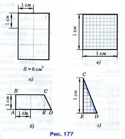 На рисунке 177, г видно, что квадратный миллиметр укладывается в треугольнике CDE 14 раз, и остаётся часть этого треугольника (она закрашена на рисунке), в которой квадратный миллиметр не укладывается целиком. Поэтому можно сказать, что площадь трапеции ABCD приближённо равна 2,14 см2. Оставшуюся часть треугольника CDE можно измерить с помощью более мелкой доли квадратного сантиметра и получить более точное значение площади трапеции. Описанный процесс измерения можно продолжить далее, однако на практике он неудобен. Обычно измеряют лишь некоторые связанные с многоугольником отрезки, а затем вычисляют площадь по определённым формулам.