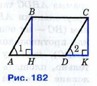 Доказательство Рассмотрим параллелограмм ABCD с площадью S. Примем сторону AD за основание и проведём высоты ВН и СК (рис. 182). Докажем, что S = AD • ВН.