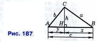 Доказательство Рассмотрим треугольник АВС, в котором AB = с, ВС = а, АС = b. В любом треугольнике по крайней мере два угла острые. Пусть А и В — острые углы треугольника АВС. Тогда основание Н высоты СН треугольника лежит на стороне АВ. Введём обозначения: CH = h, АН = у, НВ = х (рис. 187). По теореме Пифагора a2 - x2 = h2 = b2 - y2, откуда у2 - х2 = b2 - а2, или (у - х) (у + х) = b2 - а2. Так как у + х = с, то