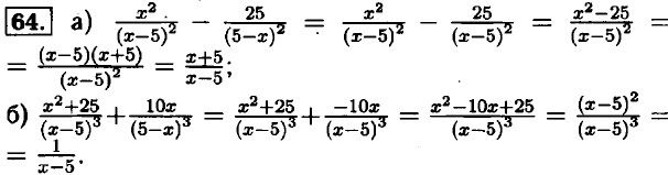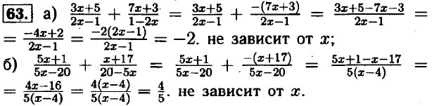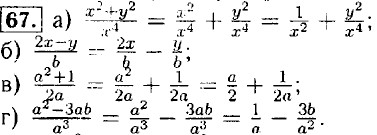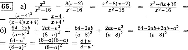 68. 69. 70. а) 3 (5х - 4) - 8х = 4x + 9; 15х - 12 - 8х = 4х + 9; 7х - 4х - 12 + 9; 3х = 21; х = 7; б) 19х - 8 (х - 3) = 66 - 3x; 19х - 8х + 24 = 66 - 3х; 11х + 3х = 66 - 24; 14х = 42; х = 3; в) 0,2 (0,7х - 5) + 0,02 = 1,4 (х - 1,6); 0,14х - 1 + 0,02 = 1,4х - 2,24; 1,26х = 1,26; х = 1; г) 2,7 (0,1х + 3,2) + 0,6 (1,3 - х) = 16,02; 0,27х + 8,64 + 0,78 - 0,6х = 16,02; -0,33х = 6,6; х = -20. 71. а) 8х4 - 16х3у = 8х3(х - 2у); б) 15ху5 + 10у2 = 5у2(3ху3 + 2); в) 8а2 - 50у2 = 2 (4а2 - 25у2) = 2(2а - 5у)(2а + 5у); г) 18b2 - 98а2 = 2 (9b2 - 49а2) = 2(3b - 7а)(3b + 7а); д) х3 - 125 = (х - 5)(х2 + 5х + 25); е) у3 + 8 = (у + 2)(у2 - 2у + 4); ж) аb + 8а + 9b + 72 = а(b + 8) + 9(b + 8) = (а + 9)(b + 8); з) 6m - 12 - 2n + mn - 6(m - 2) + n(m - 2) = (6 + n)(m - 2). 72.