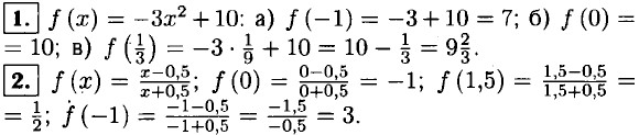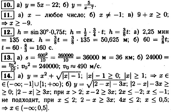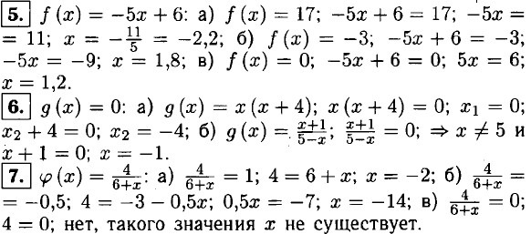 8. ƒ(x) = 0,5x - 4; а) 0,5x - 4 = -5; 0,5x = -1; x = -2; 0) 0,5x -4 = 0; 0,5x = 4; x = 8; в) 0,5x - 4 = 2,5; 0,5x = 6,5; x = 13. 9. а) x — любое число; б) x — любое число; в) x ≠ 5; г) x ≠ 4 и x ≠ -1; д) x2 + 1 > 0; ⇒ x — любое число; е) x - 5 ≥ 0; x ≥ 5.