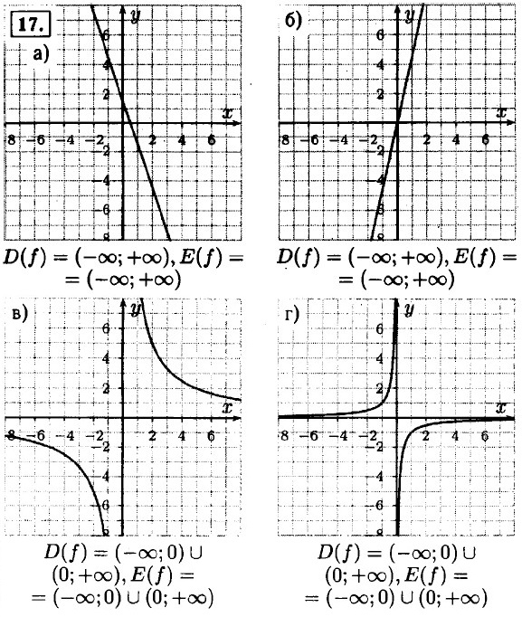18. а) ƒ(х) = 2х - 1 — график линейной функции, 1 ≤ х ≤ 4; ƒ(1) = 2 - 1 = 1; ƒ(4) = 8 - 1 = 7; область определения [1; 7]; б) g(х) = -3х + 8 — график линейной функции, -2 ≤ х ≤ 5; g(-2) = 6 + 8 = 14; g(5) = -15 + 8 = -7; область определения [-7; 14]. 19. у = х2; область определения и область значения (-∞; +∞). у = х3; область определения и область значения (-∞; +∞). у = √х; область определения и область значения (0; +∞).