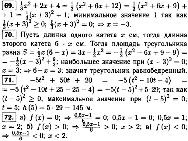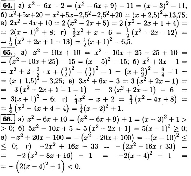 67. х2 - 6х + 11 = (х2 - 6х + 9) + 2 = (х - 3)2 + 2 > 0; -х2 + 6х - 11 = -(х2 - 6х + 11) = -(х - 3)2 - 2 < 0. 68. 2x2 - 4x + 6 = 2 (x2 - 2х + 3) = 2(x2 - 2x + 1 + 2) = 2(x — 1)2 + 4; минимальное значение 4 так как 2(x - 1)2 > 0; 2(x - 1)2 = 0; х = 1.